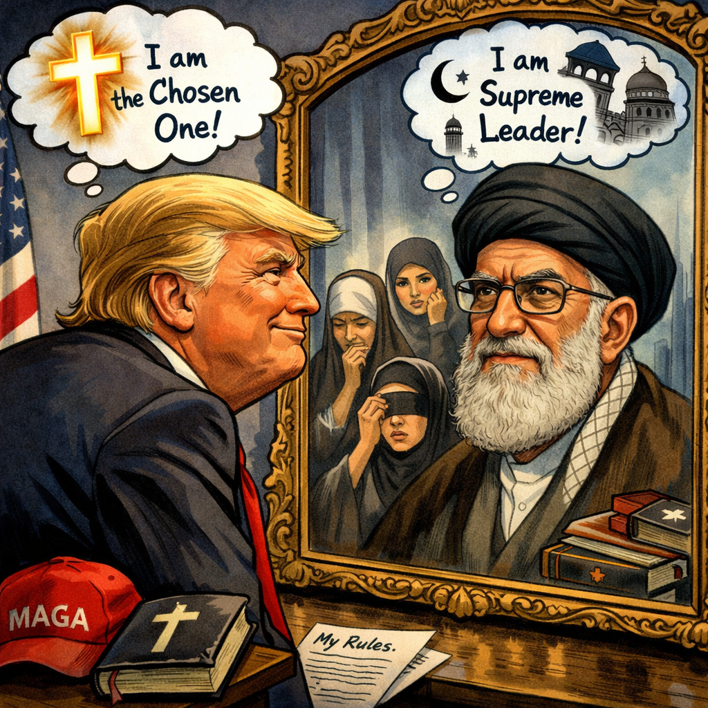 First, the death of Iran’s Supreme Leader, Ayatollah Ali Khamenei is a good thing and worth celebrating. He was an evil man who had no issue slaughtering up to 30,000 of his own people. His crimes against humanity are well documented. Women systemically faced rape, torture and death for crimes like speaking and not wearing a headdress. His near-50 years of reigning terror are over. And that’s a good fucking thing! (Khamenei vaguely reminds me of another guy who thinks he knows everything in a stunning Dunning-Kruger style, who has stripped women’s rights in his country, and sees himself as a religious Saviour…. What’s the fucker’s name? It’s on the edge of my brain….) Not too sure what’s next. But in a corrupt world living in a lawless time, it will probably not be a fair and just correction.